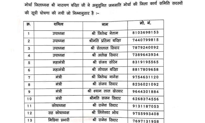 यह नियुक्ति भाजपा प्रदेशाध्यक्ष माननीय किरण सिंह देव जी एवं प्रदेश महामंत्री संगठन माननीय पवन साय जी के मार्गदर्शन तथा अनुसूचित जनजाति मोर्चा प्रदेशाध्यक्ष माननीय सत्यनारायण सिंह जी के निर्देशानुसार की गई है। जिला भाजपा अध्यक्ष माननीय ज्योतिलाल पटेल जी की सहमति से जिला अध्यक्ष श्री नारायण बरिहा द्वारा कार्यसमिति घोषित की गई।